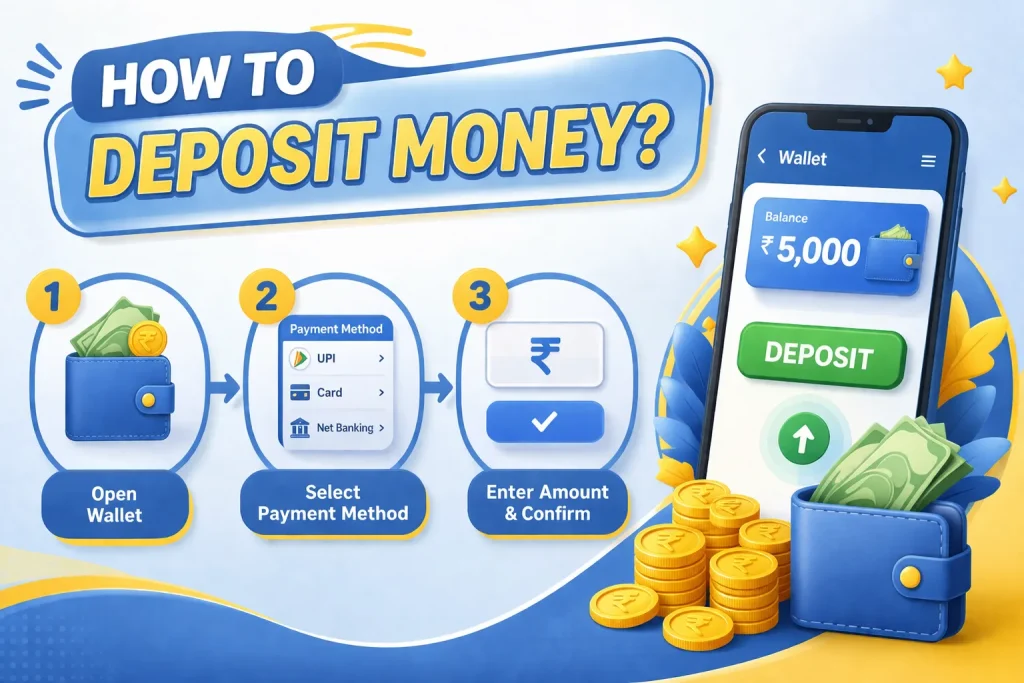 Step 2: Select Deposit and choose a payment method- UPI, Paytm, Google Pay, or USDT.